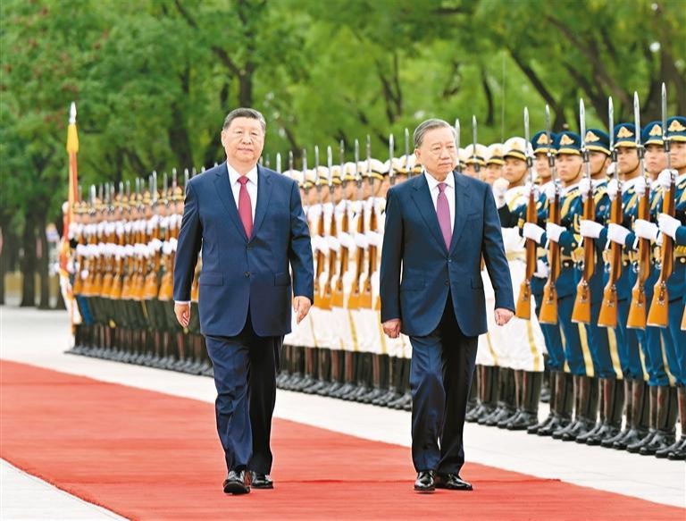 8月19日,中共中央总书记、国家主席习近平在北京人民大会堂同来华进行国事访问的越共中央总书记、国家主席苏林举行会谈。这是会谈前,习近平在人民大会堂东门外广场为苏林举行欢迎仪式。