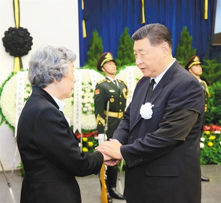 10月14日,吴邦国同志遗体在北京八宝山革命公墓火化。习近平、赵乐际、王沪宁、蔡奇、丁薛祥、李希、韩正等前往八宝山送别,胡锦涛送花圈表示哀悼。这是习近平与吴邦国亲属握手,表示深切慰问。
