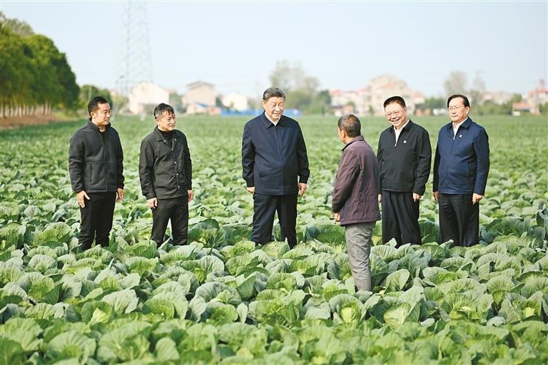 5日上午,习近平前往咸宁市嘉鱼县,首先到潘家湾镇十里蔬菜长廊考察。深秋时节,这里仍然满目青翠、生机勃勃。习近平走进田间,察看蔬菜长势,详细询问蔬菜品种、种植技术、销售等情况。他强调,农村天地广阔,农业大有可为。发展现代农业,建设农业强国,必须依靠科技进步,让科技为农业现代化插上腾飞的翅膀。他勉励当地干部群众走科技之路、质量之路、品牌之路,把蔬菜种植这个富民产业进一步做好,让更多群众增收致富。