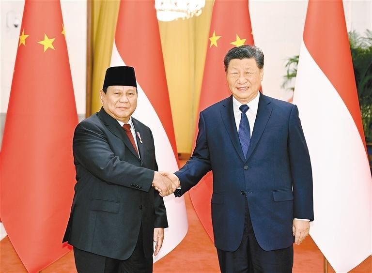十一月九日下午,国家主席习近平在北京人民大会堂同来华进行国事访问的印度尼西亚总统普拉博沃举行会谈。这是习近平同普拉博沃握手。