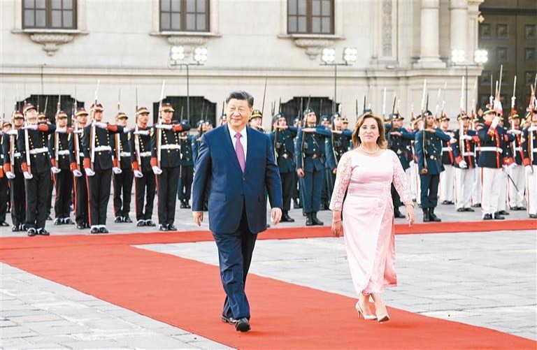 习近平指出,这是我第三次访问秘鲁,也是一年时间里第三次同总统女士会晤。许多秘鲁民众自发聚集道路两旁,挥手致意表示欢迎,让我深切感受到秘鲁人民对中国人民的友好情谊。中秘同为文明古国。古老文明的深厚积淀,赋予中秘两国智慧和胸怀,让我们能够看清历史前进方向,顺应时代发展潮流,始终坚持平等相待、互尊互信、互学互鉴,成为不同体量、不同制度、不同文化国家团结合作的典范。建交53年来,特别是我2016年对秘鲁进行首次国事访问以来,在双方共同努力下,中秘贸易投资合作快速增长,为两国人民带来实实在在的利益。双方要总结经验,推动两国务实合作提质升级,使中秘全面战略伙伴关系不断迈上新台阶,更好造福两国人民。