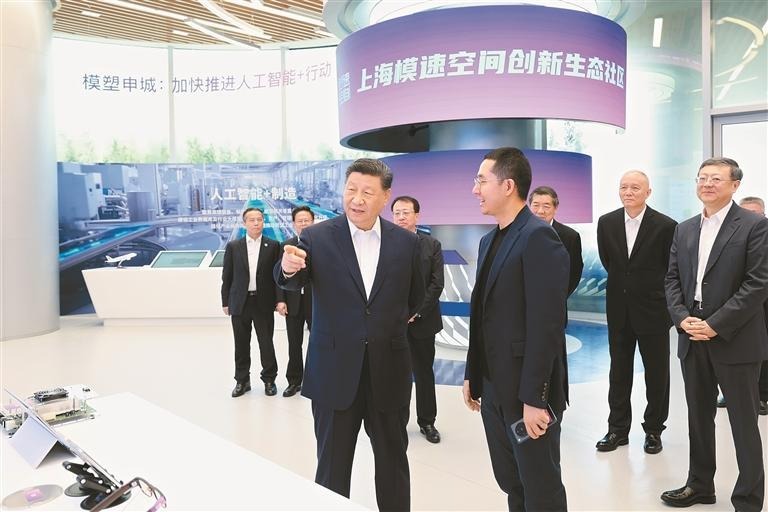 “模速空间”是上海市打造的人工智能大模型专业孵化和加速平台,已入驻企业100余家。习近平来到这里,通过视频短片了解上海市人工智能产业发展情况,察看重点孵化企业的大模型产品展示,听取相关技术研发和企业生产经营介绍。习近平对上海积极发展人工智能取得的实效给予肯定。他指出,人工智能技术加速迭代,正迎来爆发式发展,上海要总结好以大模型产业生态体系孵化人工智能产业等成功经验,加大探索力度,力争在人工智能发展和治理各方面走在前列,产生示范效应。