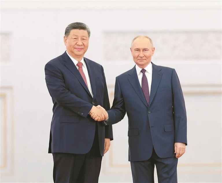 当地时间5月8日上午,俄罗斯总统普京同中国国家主席习近平在莫斯科克里姆林宫举行会谈。两国元首就中俄关系和重大国际和地区问题深入交换意见,一致同意坚定不移深化战略协作,推动中俄关系稳定、健康、高水平发展;共同弘扬正确二战史观,维护联合国权威和地位,维护国际公平正义。