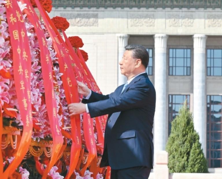 九月三十日上午,党和国家领导人习近平、李强、赵乐际、王沪宁、蔡奇、丁薛祥、李希、韩正等来到北京天安门广场,出席烈士纪念日向人民英雄敬献花篮仪式。这是习近平整理花篮上的缎带。