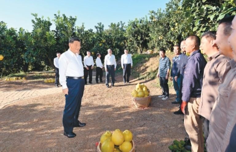 金柚是梅州的特色农产品。正值收获季节,柚子园硕果累累。习近平来到雁洋镇南福金柚种植基地,在展示厅听取广东加大对革命老区支持力度、推进乡村全面振兴等情况汇报,察看柚子及其加工产品、文创产品。他走进果林,同果农和农技人员亲切交流。得知今年金柚喜获丰收、销路畅通,习近平十分高兴。他指出,发展乡村特色产业是推进乡村全面振兴的基础,要加强科技应用,推动农文旅融合,不断延伸产业链、增加附加值,带动更多农民群众增收致富。