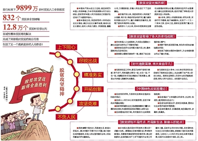 习近平指出,脱贫攻坚取得举世瞩目的成就,靠的是党的坚强领导,靠的是中华民族自力更生、艰苦奋斗的精神品质,靠的是新中国成立以来特别是改革开放以来积累的坚实物质基础,靠的是一任接着一任干的坚守执着,靠的是全党全国各族人民的团结奋斗。我们立足我国国情,把握减贫规律,出台一系列超常规政策举措,构建了一整套行之有效的政策体系、工作体系、制度体系,走出了一条中国特色减贫道路,形成了中国特色反贫困理论。主要是:坚持党的领导,为脱贫攻坚提供坚强政治和组织保证;坚持以人民为中心的发展思想,坚定不移走共同富裕道路;坚持发挥我国社会主义制度能够集中力量办大事的政治优势,形成脱贫攻坚的共同意志、共同行动;坚持精准扶贫方略,用发展的办法消除贫困根源;坚持调动广大贫困群众积极性、主动性、创造性,激发脱贫内生动力;坚持弘扬和衷共济、团结互助美德,营造全社会扶危济困的浓厚氛围;坚持求真务实、较真碰硬,做到真扶贫、扶真贫、脱真贫。这些重要经验和认识,是我国脱贫攻坚的理论结晶,是马克思主义反贫困理论中国化最新成果,必须长期坚持并不断发展。