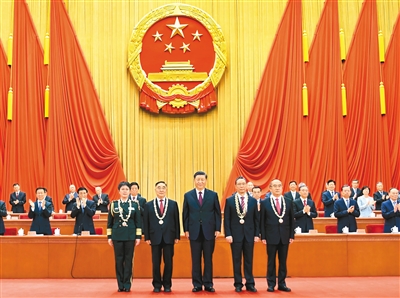 在雄壮的《向祖国英雄致敬》乐曲声中,习近平为国家勋章和国家荣誉称号获得者一一颁授勋章奖章,并同他们亲切握手、表示祝贺。随后,4位国家勋章和国家荣誉称号获得者受邀到主席台就座。全场响起一阵阵热烈的掌声。