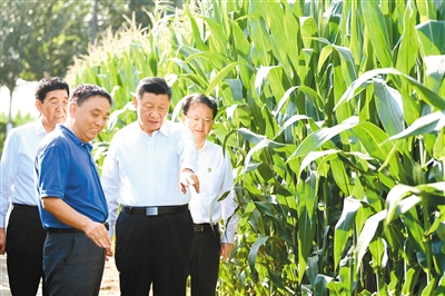 习近平走进玉米地,察看黑土地实验样品和玉米优良品种展示,了解农业科技研发利用、黑土地保护情况。习近平强调,农业现代化,关键是农业科技现代化。要加强农业与科技融合,加强农业科技创新,科研人员要把论文写在大地上,让农民用最好的技术种出最好的粮食。要认真总结和推广梨树模式,采取有效措施切实把黑土地这个“耕地中的大熊猫”保护好、利用好,使之永远造福人民。