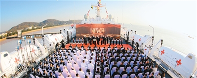 中央宣传部13日在浙江舟山某军港向全社会宣传发布海军“和平方舟”号医院船的先进事迹,授予医院船“时代楷模”称号。