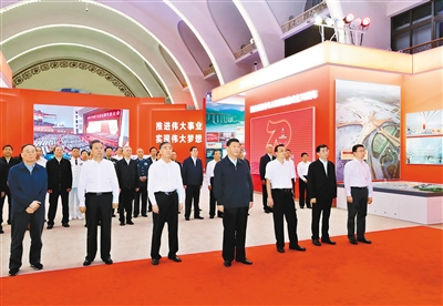 下午4时10分许,习近平等党和国家领导同志来到北京展览馆,步入展厅参观展览。展览以开辟和发展中国特色社会主义道路、建设社会主义现代化国家为主题,以编年体为时间主线,安排设计了5个部分,并体现历次党代会和重要中央全会、五年规划(计划)等方面的跨段主线,选择150个“新中国第一”进行展示,每10年设置英雄模范人物墙,充分运用声光电等多媒体科技展示手段,全方位立体化呈现新中国成立70年来中国共产党领导中国人民发愤图强、艰苦奋斗实现的伟大跨越,清晰展现党的领导和我国社会主义制度集中力量办大事的政治优势,深刻揭示新中国70年巨变背后的深刻道理。
