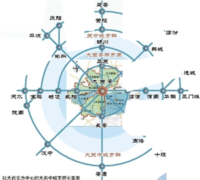 组建大西安,实现西咸一体化还不够。因为大西安还只是与重庆、成都、武汉、郑州抗衡而已,不像当年的汉唐长安是鹤立鸡群,还不足以担负起丝绸之路经济带新起点和丝绸之路经济带中国中心的重任。为此,还必须整合大关中,构建大西安为中心的大关中城市群。国家在关中周边布局了跨省域的成渝城市群、长江中游城市群、中原城市群及呼包鄂榆城市群,都比关中城市群大。特别是和关中同处亚欧大陆桥经济带的中原城市群,是以国家中心城市郑州大都市区为中心,辐射河南、山西、安徽、河北、山东五省的大中原城市群,对西安为中心的关中城市群形成强大压力和挑战。目前陕西联合甘肃构建的关中—天水城市群虽然是跨省域的,但远不如成渝城市群、长江中游城市群和中原城市群,担负不起丝绸之路经济带新起点和“一带一路”核心区的重任。
