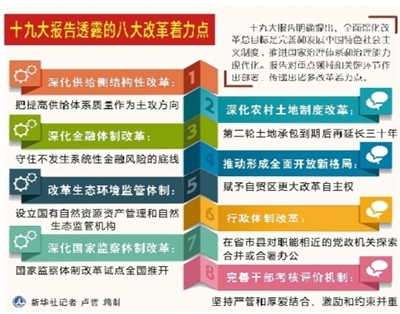 十九大报告明确提出,全面深化改革总目标是完善和发展中国特色社会主义制度、推进国家治理体系和治理能力现代化。报告对重点领域和关键环节作出部署,传递出诸多改革着力点。