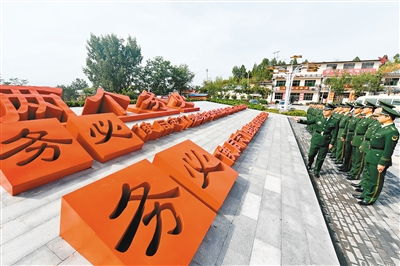 石家庄公安消防支队西柏坡中队官兵在河北省平山县西柏坡村“两个务必”广场内参观(10月11日摄)。 (新华社记者 牟宇 摄)