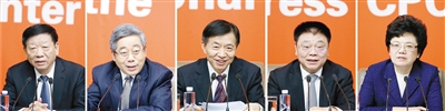 教育部党组书记、部长陈宝生(左二),民政部党组书记、部长黄树贤(中),人力资源和社会保障部党组书记、部长尹蔚民(左一),住房和城乡建设部党组书记、部长王蒙徽(右二),国家卫生和计划生育委员会党组书记、主任李斌介绍满足人民新期待,保障改善民生有关情况,并回答记者提问(拼版照片)。