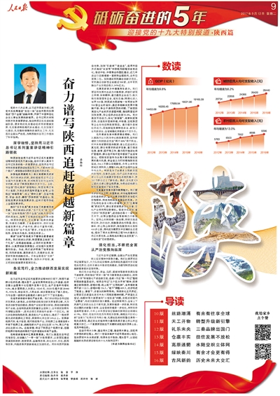 昨日,《人民日报》“砥砺奋进的5年——迎接党的十九大特别报道·陕西篇”新鲜出炉。权威的解读与讲述、鲜活的人物与故事、翔实的数据与对比、丰富的照片与画面……一幅幅陕西省砥砺奋进、追赶超越的画面跃然纸上。