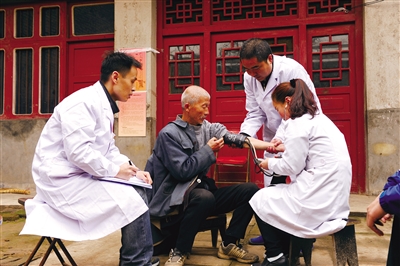 在酒务头村,来自长安区医院的医生为村民们进行免费诊疗。贫困户马清娥今年65岁,此前在扶贫干部的帮助下,给心脏安装了起搏器。她的老伴儿种忠患有高血压,儿子患有精神疾病。医生为种忠老人进行了检查,并开了几服药,悉心叮嘱他监测血压,令老人十分感动。