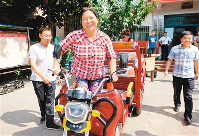 王巧茸高兴地骑上了崭新的农用三轮车。