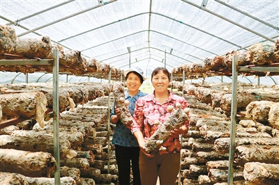 怀抱即将长成的食用菌棒,村民们笑得很开心。