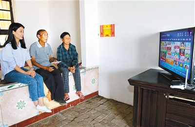在大家的帮助下,贫困户雷保友家看上了网络电视,扶贫干部杨祎陪两位老人拉家常商议如何脱贫。