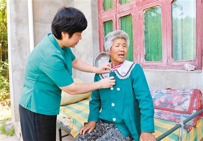 朱玉荣给贫困户张成银的妻子李格格整理衣服。