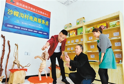 5月18日是葛牌街道的集日,往日总爱在集日里售卖在山上收集的各式形状奇特、造型各异的天然枯木根艺的沙帽沟村四组村民唐成浩,却没有去赶集。他说要在家里等贵客上门。详细一问,才知唐成浩说的贵客,原来是县经贸局派出的蓝田县电子商务中心的工作人员。他们要来给唐成浩等村民教授如何在网上操作销售自家的土特产。