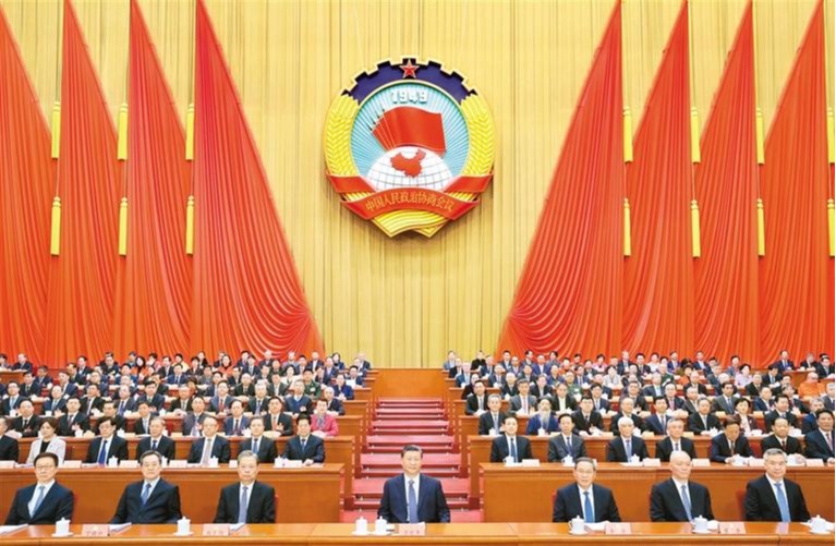 3月4日下午,中国人民政治协商会议第十四届全国委员会第二次会议在北京人民大会堂开幕。这是习近平、李强、赵乐际、蔡奇、丁薛祥、李希、韩正在主席台就座。 全国政协主席王沪宁代表政协第十四届全国委员会常务...