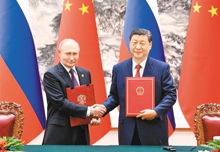 5月16日上午,国家主席习近平在北京人民大会堂同来华进行国事访问的俄罗斯总统普京举行会谈。这是会谈后,两国元首共同签署并发表《中华人民共和国和俄罗斯联邦在两国建交75周年之际关于深化新时代全面战略协作...