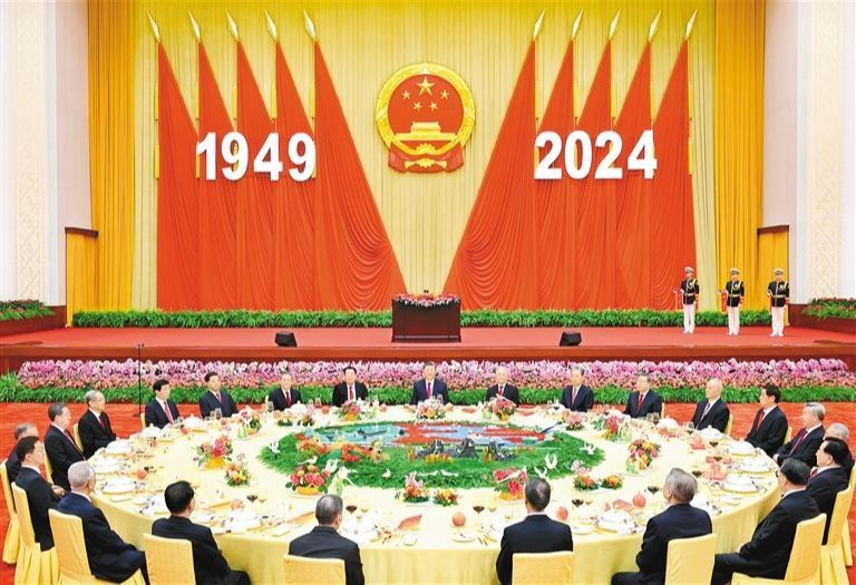 九月三十日晚,庆祝中华人民共和国成立七十五周年招待会在北京人民大会堂隆重举行。习近平、李强、赵乐际、王沪宁、蔡奇、丁薛祥、李希、韩正等党和国家领导人与约三千名中外人士欢聚一堂,共庆新中国七十五周年...