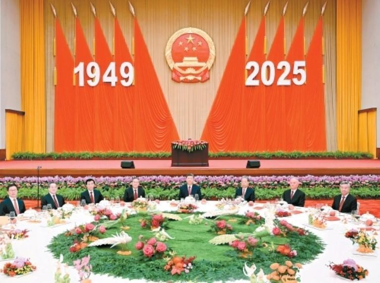 九月三十日晚,庆祝中华人民共和国成立七十六周年招待会在北京人民大会堂举行。习近平、李强、赵乐际、王沪宁、蔡奇、丁薛祥、李希、韩正等党和国家领导人与中外人士欢聚一堂,共庆中华人民共和国华诞。庆祝中华...